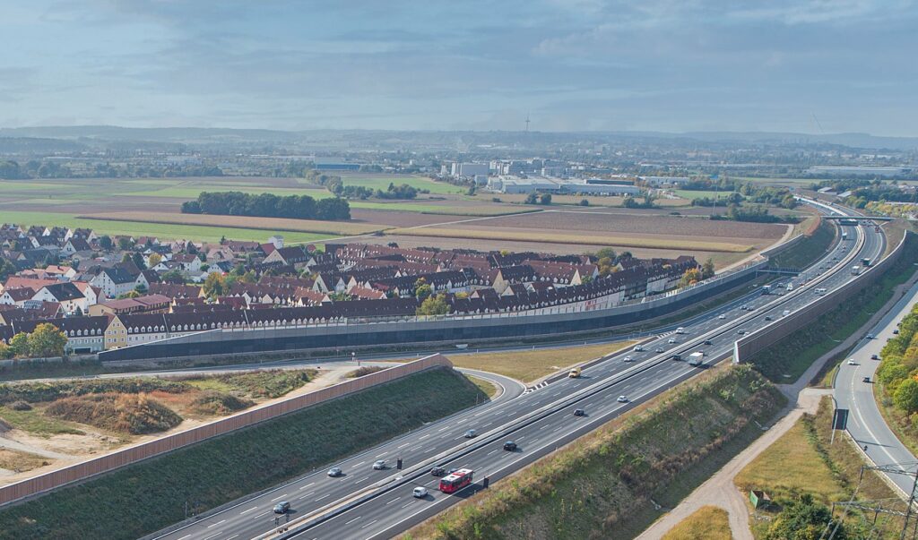 | Lärmschutzwandelemente | Stahlbetonfertigteile, autobahnseitig hochabsorbierende Porenbetonoberfläche bzw. hochabsorbierende Holz-Vorsatzschale, anliegerseitig Verkleidung mit Holzstaketen, obere Wandhälfte mit transparenten Elemente aus Acrylglas bei hohen Wandabschnitten |